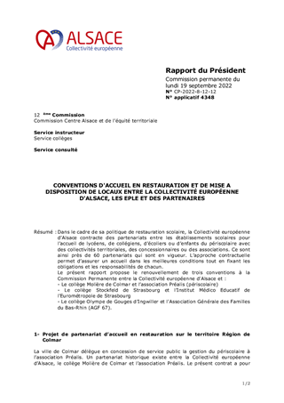 Dans le cadre de sa politique de restauration scolaire, la Collectivité européenne d’Alsace contracte des partenariats entre les établissements scolaires pour l’accueil de lycéens, de collégiens, d’écoliers ou d’enfants du périscolaire avec des collectivités territoriales, des concessionnaires ou des associations. Ce sont ainsi près de 60 partenariats qui sont en vigueur. L’approche contractuelle permet d’assurer un accueil dans les meilleures conditions tout en fixant les obligations et les responsabilités de chacun. Le présent rapport propose le renouvellement de trois conventions à la Commission Permanente entre la Collectivité européenne d'Alsace et : - Le collège Molière de Colmar et l’association Préalis (périscolaire) - Le collège Stockfeld de Strasbourg et l’Institut Médico Educatif de l'Eurométropole de Strasbourg - Le collège Olympe de Gouges d’Ingwiller et l'Association Générale des Familles du Bas-Rhin (AGF 67).