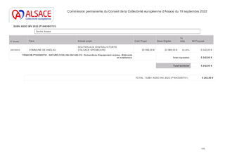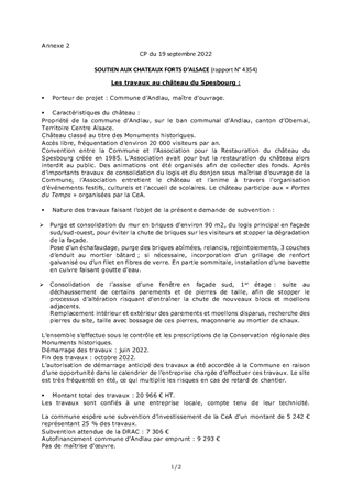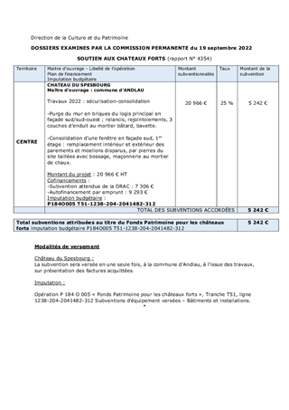 Dans le cadre de sa politique en faveur de la Culture, du Patrimoine et du rayonnement alsacien, la Collectivité européenne d’Alsace accompagne par son ingénierie les associations castrales bénévoles et soutient également par des aides financières les travaux réalisés pour sauvegarder et valoriser les châteaux forts d’Alsace. A cet effet, le "Fonds Patrimoine pour les Châteaux Forts d’Alsace" est un dispositif susceptible d’être sollicité notamment par les associations et les communes bénéficiant de la maîtrise d’ouvrage. L’aide financière que la Collectivité européenne d’Alsace peut décider d’attribuer, contribue à renforcer l’engagement des partenaires locaux (bénévoles, communes impliquées, …) dans la préservation du patrimoine castral alsacien. Au titre du Fonds précité, le présent rapport propose à la Commission permanente d'attribuer une subvention d'investissement d'un montant de 5 242 € en faveur de la Commune d’Andlau, pour des travaux de sécurisation et de conservation au château du Spesbourg.