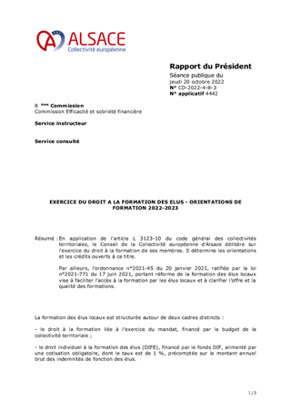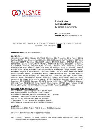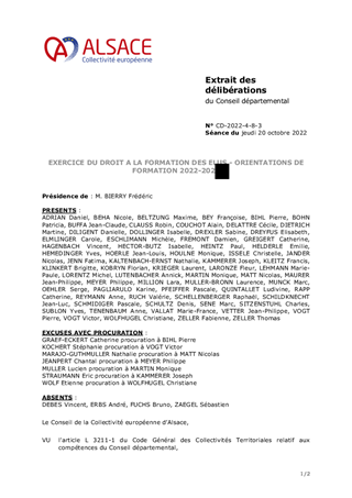 En application de l'article L 3123-10 du code général des collectivités territoriales, le Conseil de la Collectivité européenne d’Alsace délibère sur l'exercice du droit à la formation de ses membres. Il détermine les orientations et les crédits ouverts à ce titre. Par ailleurs, l’ordonnance n°2021-45 du 20 janvier 2021, ratifiée par la loi n°2021-771 du 17 juin 2021, portant réforme de la formation des élus locaux vise à faciliter l’accès à la formation par les élus locaux et à clarifier l’offre et la qualité des formations.