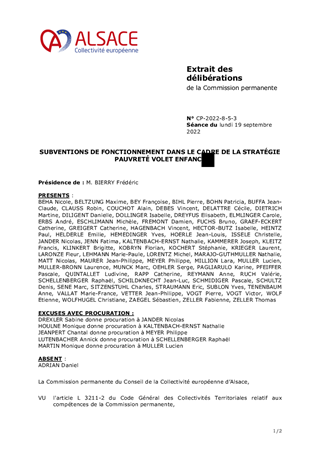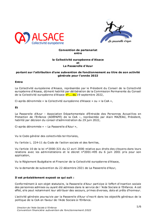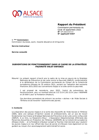 Le présent rapport s'inscrit ans le cadre de la mise en œuvre de la Stratégie Nationale de Prévention et de Lutte contre la Pauvreté (SNPLP), conformément à la délibération de la Commission permanente du Conseil de la Collectivité européenne d’Alsace du 25 octobre 2021, portant sur l’adoption des avenants financiers 2021/2022 aux conventions d’appui à la lutte contre la pauvreté. il est proposé de reconduire, pour 2022, l’octroi de subventions de fonctionnement, pour un montant total de 113 213 € (93 213 € pour l’ADEPAPE et 20 000 € pour la Fondation d’Auteuil). Ces dernières permettent de prévenir les sorties « sèches » de l’Aide Sociale à l’Enfance et de travailler l'autonomie des jeunes.