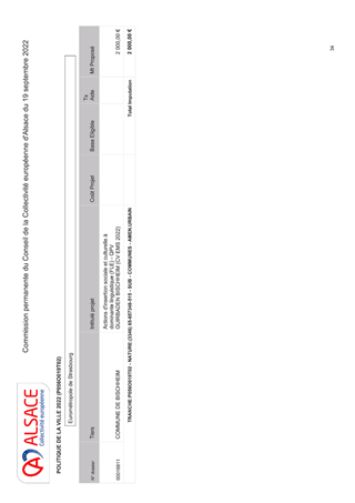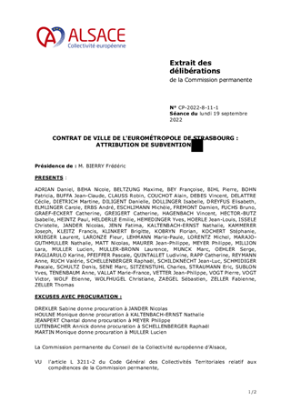 Conformément à la loi relative à la Ville et à la cohésion urbaine promulguée le 21 février 2014, le Département du Bas-Rhin a adopté lors de la réunion de son Assemblée Plénière du 6 juillet 2015 (CD/2015/84), le Contrat de Ville de l'Eurométropole de Strasbourg pour la période 2015-2020. Ce contrat a été conclu par le Département du Bas-Rhin et ses partenaires le 10 juillet 2015. La durée des Contrats de Ville a été prorogée de deux ans jusqu’en 2022 au titre de la Loi de Finances 2019, puis d'une année supplémentaire jusqu'en 2023 au titre de la Loi de finances 2022. Le présent rapport a pour objet de proposer à la Commission permanente de décider d’attribuer des subventions de fonctionnement pour un montant total de 35 295 € concernant les projets pour lesquels la Collectivité européenne d'Alsace a été sollicitée au titre du fonds de développement urbain, dans le cadre de l'appel à projets 2022 du Contrat de Ville de l’Eurométropole de Strasbourg.