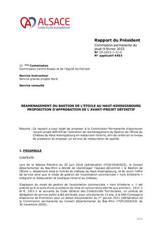 Ce rapport a pour objet de proposer à la Commission Permanente d’approuver l’avant-projet définitif de l'opération de réaménagement du Bastion de l’Etoile du Château du Haut-Koenigsbourg en restaurant-librairie, afin de renforcer le niveau de prestation et proposer un service de restauration de qualité.