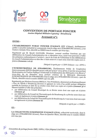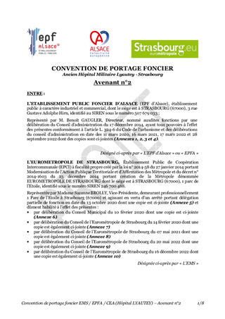 Le présent rapport a pour objet l’approbation d’un avenant n°2 à la convention tripartite de portage par l’EPF d’Alsace relatif aux études et travaux à entreprendre sur le site de l’ancien hôpital LYAUTEY à Strasbourg, dans le cadre du projet du nouveau collège du Neuhof. Cet avenant d’ordre technique ne modifie ni le calendrier général ni le budget de l’opération.
