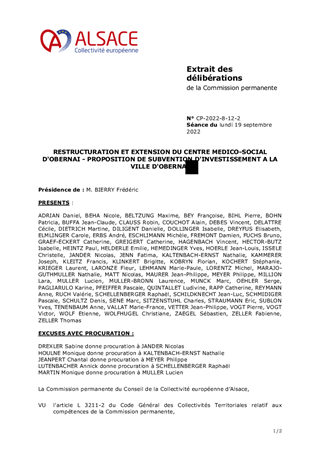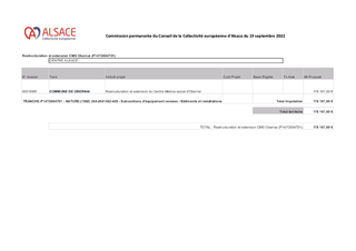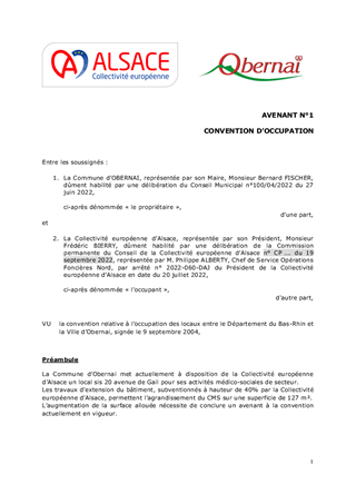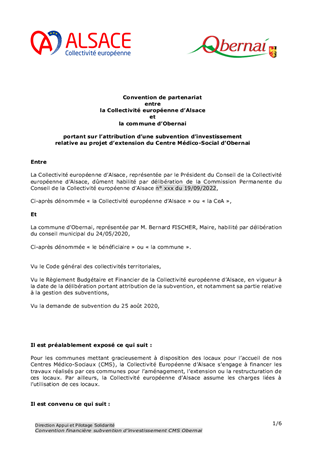 En raison de l’accroissement de son activité, les locaux du Centre Médico-Social (CMS) d’Obernai, propriété de la Ville d’Obernai, ne permettaient plus de répondre de manière satisfaisante à l’accueil du public. A la demande de la Collectivité européenne d’Alsace, la Ville d’Obernai a accepté d’agrandir et restructurer les locaux du CMS. Le coût de l’opération s’élève pour la Ville à 445 417 € HT. Une subvention d'investissement de 178 167 €, soit 40 % du coût de l’opération, est proposé en faveur de la Ville d’Obernai.