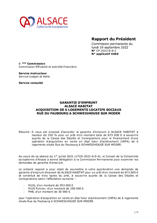 Il vous est proposé d’accorder la garantie d'emprunt à ALSACE HABITAT à hauteur de 100 % pour un prêt d’un montant total de 873 000 € à souscrire auprès de la Caisse des Dépôts et Consignations pour le financement d'une opération d’acquisition en vente en état futur d'achèvement (VEFA) de 6 logements situés Rue du Faubourg à SCHWEIGHOUSE SUR MODER.