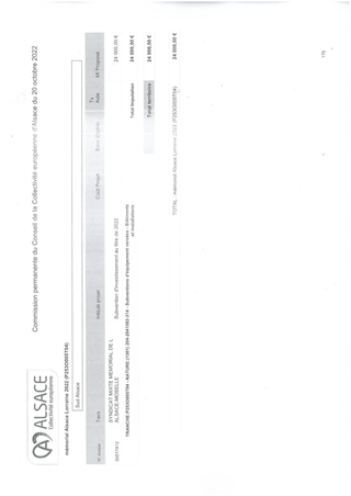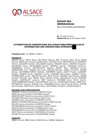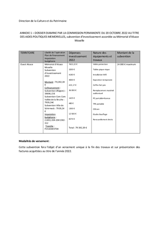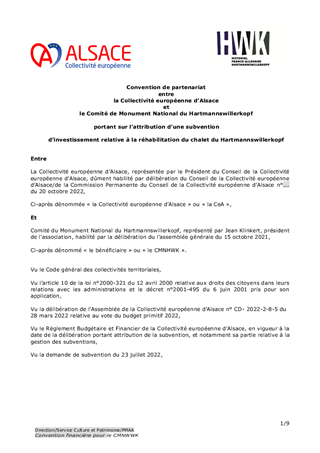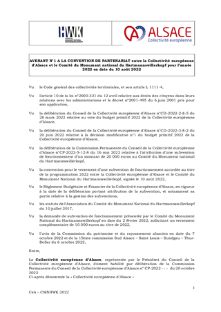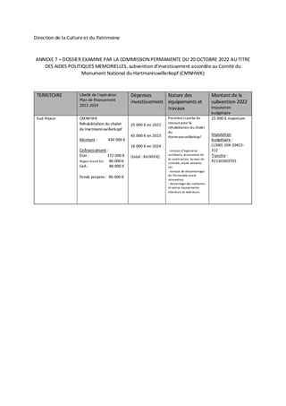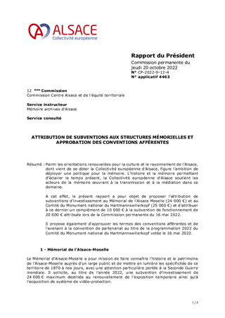 Parmi les orientations renouvelées pour la culture et le rayonnement de l’Alsace, dont vient de se doter la Collectivité européenne d’Alsace, figure l’ambition de déployer une politique pour la mémoire. L'histoire et la mémoire permettant d’éclairer le temps présent, la Collectivité européenne d'Alsace soutient les acteurs de la mémoire œuvrant à la transmission et à la médiation dans ce domaine. A cet effet, le présent rapport a pour objet de proposer l'attribution de subventions d’investissement au Mémorial de l’Alsace Moselle (24 000 €) et au Comité du Monument national du Hartmannswillerkopf (25 000 €) et d'attribuer à ce dernier un complément de 10 000 € à la subvention de fonctionnement de 20 000 € attribuée lors de la Commission permanente du 16 mai 2022. Il propose également d'approuver les termes des conventions afférentes et de l'avenant à la convention de partenariat au titre de la programmation 2022 du Comité du Monument national du Hartmannswillerkopf votée le 16 mai 2022.