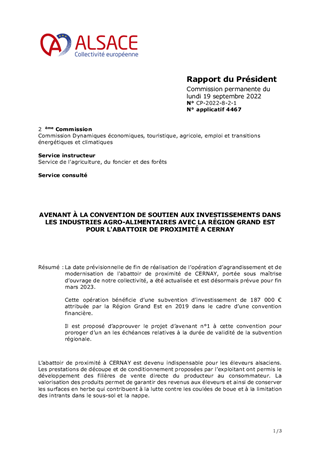 La date prévisionnelle de fin de réalisation de l’opération d’agrandissement et de modernisation de l'abattoir de proximité de CERNAY, portée sous maîtrise d’ouvrage de notre collectivité, a été actualisée et est désormais prévue pour fin mars 2023. Cette opération bénéficie d’une subvention d’investissement de 187 000 € attribuée par la Région Grand Est en 2019 dans le cadre d’une convention financière. Il est proposé d’approuver le projet d’avenant n°1 à cette convention pour proroger d’un an les échéances relatives à la durée de validité de la subvention régionale.