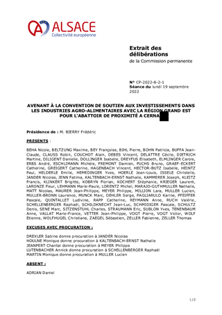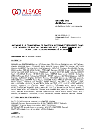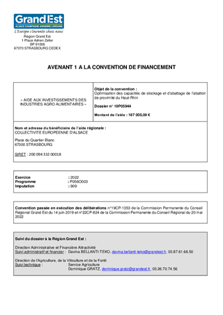 AVENANT À LA CONVENTION DE SOUTIEN AUX INVESTISSEMENTS DANS LES INDUSTRIES AGRO-ALIMENTAIRES AVEC LA RÉGION GRAND EST POUR L'ABATTOIR DE PROXIMITÉ A CERNAY