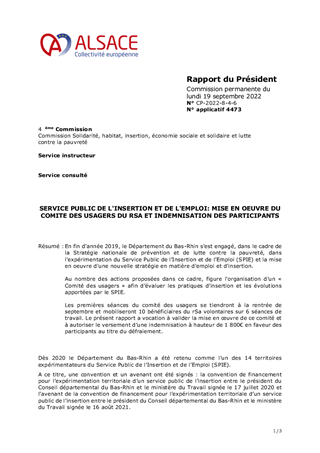 En fin d’année 2019, le Département du Bas-Rhin s’est engagé, dans le cadre de la Stratégie nationale de prévention et de lutte contre la pauvreté, dans l'expérimentation du Service Public de l’Insertion et de l’Emploi (SPIE) et la mise en oeuvre d'une nouvelle stratégie en matière d'emploi et d'insertion. Au nombre des actions proposées dans ce cadre, figure l'organisation d’un « Comité des usagers » afin d’évaluer les pratiques d’insertion et les évolutions apportées par le SPIE. Les premières séances du comité des usagers se tiendront à la rentrée de septembre et mobiliseront 10 bénéficiaires du rSa volontaires sur 6 séances de travail. Le présent rapport a vocation à valider la mise en œuvre de ce comité et à autoriser le versement d’une indemnisation à hauteur de 1 800€ en faveur des participants au titre du défraiement.