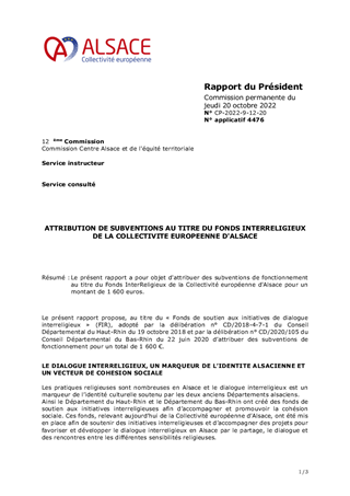 Le présent rapport a pour objet d'attribuer des subventions de fonctionnement au titre du Fonds InterReligieux de la Collectivité européenne d'Alsace pour un montant de 1 600 euros.