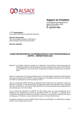 Le présent rapport procède à la répartition communale et intercommunale du fonds départemental de péréquation de taxe professionnelle 2022 conformément à la délibération du Conseil de la Collectivité européenne d'Alsace du 18 octobre 2021.