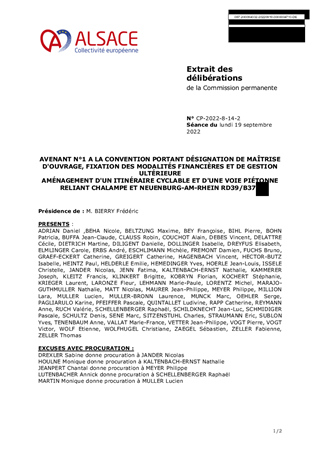Le présent rapport a pour objet d’approuver les termes de l’avenant n° 1 à la convention de transfert temporaire de maîtrise d’ouvrage, de financement et de gestion ultérieure n° 21 signée le 27 septembre 2021 avec Mulhouse Alsace Agglomération (m2A) et le Regierungspräsidium de Freiburg qui vise à modifier le coût global de l’opération d’aménagement d’un itinéraire cyclable et d’une voie piétonne reliant CHALAMPE (RD 39) et NEUENBURG-AM-RHEIN en Allemagne (B 378), porté à 2 637 426,57€ HT suite à des aléas de chantier, et à définir la nouvelle participation financière des parties en présence.