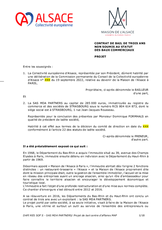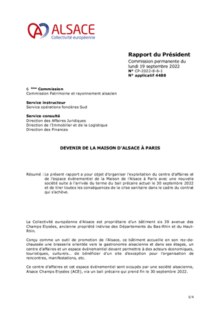 Le présent rapport a pour objet d’organiser l’exploitation du centre d’affaires et de l’espace événementiel de la Maison de l’Alsace à Paris avec une nouvelle société suite à l’arrivée du terme du bail précaire actuel le 30 septembre 2022 et de tirer toutes les conséquences de la crise sanitaire dans le cadre du contrat qui s’achève.