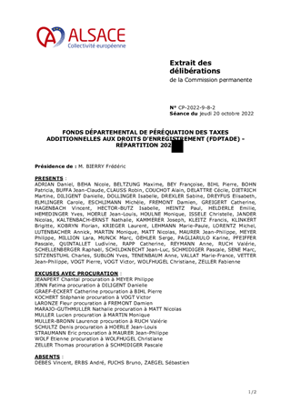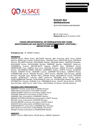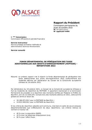 Le présent rapport vise à répartir le fonds départemental de péréquation des taxes additionnelles aux droits d'enregistrement 2022 conformément aux modalités définies par délibération du Conseil de la Collectivité européenne d'Alsace du 18 octobre 2021.