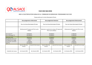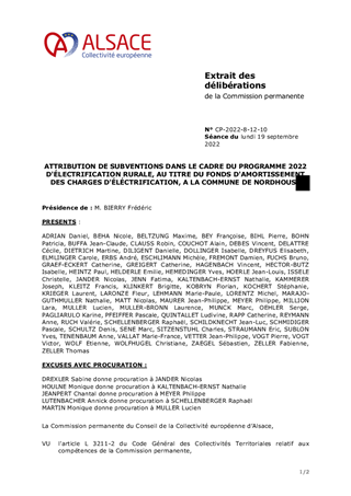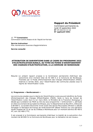 Le présent rapport propose à la Commission permanente d’attribuer des subventions d'un montant total de 92 000 € à la Commune de Nordhouse, financées par le Fonds d’Amortissement des Charges d’Electrification (FACE), relatives à l’année 2022, pour l’électrification des communes placées sous le régime de l’électrification rurale.