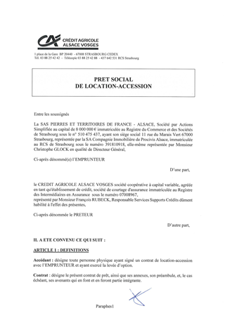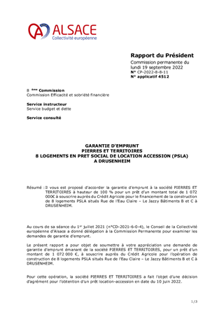 Il vous est proposé d’accorder la garantie d'emprunt à la société PIERRES ET TERRITOIRES à hauteur de 100 % pour un prêt d’un montant total de 1 072 000€ à souscrire auprès du Crédit Agricole pour le financement de la construction de 8 logements PSLA situés Rue de l’Eau Claire – Le Jazzy Bâtiments B et C à DRUSENHEIM.