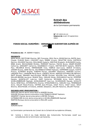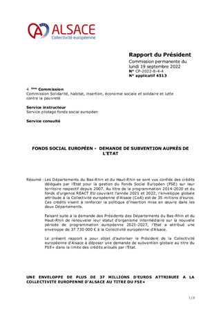 Les Départements du Bas-Rhin et du Haut-Rhin se sont vus confiés des crédits délégués par l’Etat pour la gestion du Fonds Social Européen (FSE) sur leur territoire respectif depuis 2007. Au titre de la programmation 2014-2020 et du fonds d’urgence REACT EU couvrant l’année 2021 et 2022, l’enveloppe globale attribuée à la Collectivité européenne d’Alsace (CeA) est de 35 millions d’euros. Ces crédits visent à renforcer la politique d’insertion mise en œuvre dans les deux Départements. Faisant suite à la demande des Présidents des Départements du Bas-Rhin et du Haut-Rhin de renouveler leur statut d’organisme intermédiaire sur la nouvelle période de programmation européenne 2021-2027, l’Etat a attribué une enveloppe de 37 730 000 € à la Collectivité européenne d’Alsace. Le présent rapport a pour objet d’autoriser le Président de la Collectivité européenne d’Alsace à déposer une demande de subvention globale au titre du FSE+ dans la limite des crédits alloués par l’Etat.