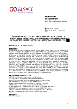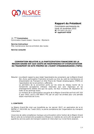 Le présent rapport a pour objet l’approbation du versement, par la Région Grand Est, d’une participation financière annuelle au titre du coût de maintenance et d’exploitation du Transport en Site Propre de l’Ouest strasbourgeois (TSPO) et l’approbation de la convention y afférente. Le périmètre de la convention porte sur les voies du réseau routier de la Collectivité européenne d’Alsace réservées aux cars régionaux et les aménagements dédiés tels que les quais, les feux tricolores de régulation du trafic et les parkings relais. Le montant de la participation annuelle de la Région Grand Est est fixé à 87 333 € pour 2022, puis à 150 000 € TTC par an pour les années pour une période totale maximale de 5 ans.