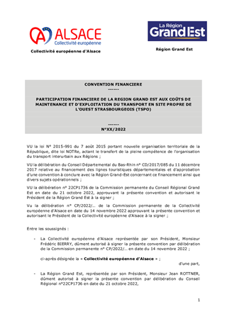CONVENTION RELATIVE A LA PARTICIPATION FINANCIERE DE LA REGION GRAND EST AUX COÛTS DE MAINTENANCE ET D'EXPLOITATION DU TRANSPORT EN SITE PROPRE DE L'OUEST STRASBOURGEOIS (TSPO)