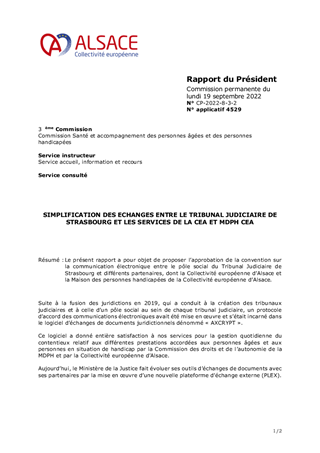 Le présent rapport a pour objet de proposer l’approbation de la convention sur la communication électronique entre le pôle social du Tribunal Judiciaire de Strasbourg et différents partenaires, dont la Collectivité européenne d’Alsace et la Maison des personnes handicapées de la Collectivité européenne d’Alsace.