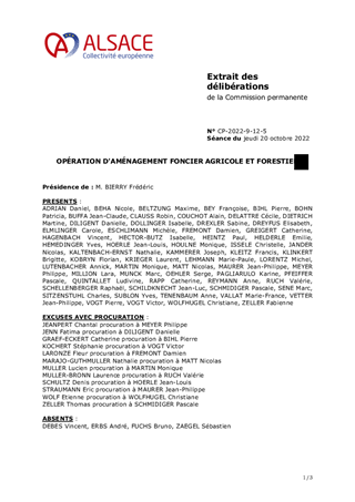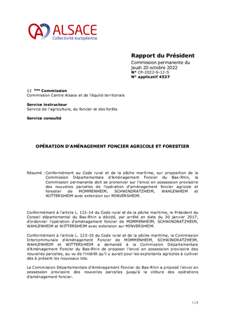 Conformément au Code rural et de la pêche maritime, sur proposition de la Commission Départementale d'Aménagement Foncier du Bas-Rhin, la Commission permanente doit se prononcer sur l’envoi en possession provisoire des nouvelles parcelles de l'opération d'aménagement foncier agricole et forestier de MOMMENHEIM, SCHWINDRATZHEIM, WAHLENHEIM et WITTERSHEIM avec extension sur MINVERSHEIM.