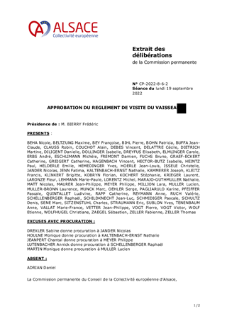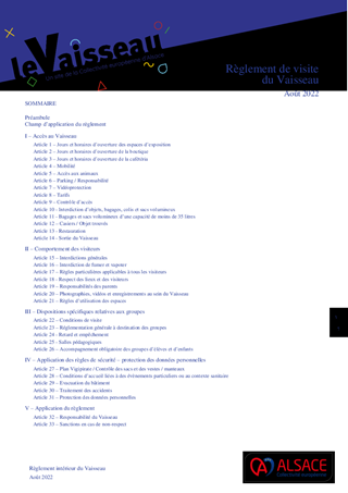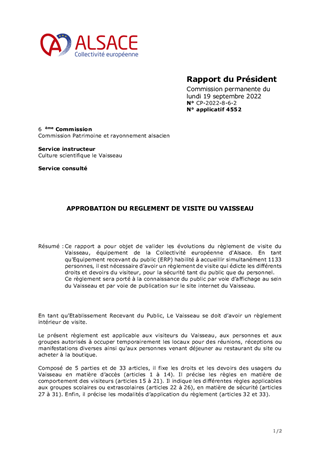Ce rapport a pour objet de valider les évolutions du règlement de visite du Vaisseau, équipement de la Collectivité européenne d'Alsace. En tant qu'Equipement recevant du public (ERP) habilité à accueillir simultanément 1133 personnes, il est nécessaire d'avoir un règlement de visite qui édicte les différents droits et devoirs du visiteur, pour la sécurité tant du public que du personnel. Ce règlement sera porté à la connaissance du public par voie d’affichage au sein du Vaisseau et par voie de publication sur le site internet du Vaisseau.