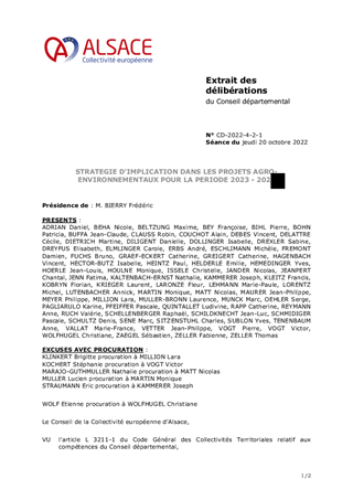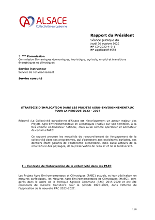 La Collectivité européenne d'Alsace est historiquement un acteur majeur des Projets Agro-Environnementaux et Climatiques (PAEC) sur son territoire, à la fois comme co-financeur national, mais aussi comme opérateur et animateur de certains PAEC. Ce rapport propose les modalités du renouvellement de l'engagement de la collectivité dans ces programmes, qui s'adressent aux exploitants agricoles, ces derniers étant garants de l'autonomie alimentaire, mais aussi acteurs de la réouverture des paysages, de la préservation de l'eau et et de la biodiversité.