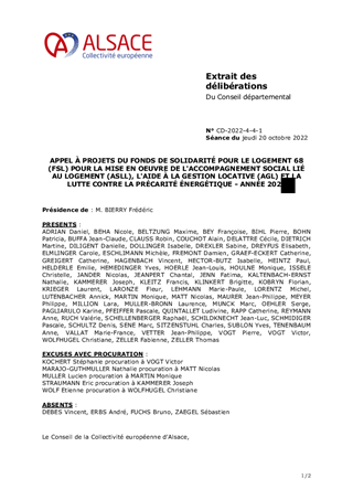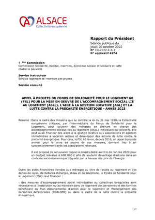 Dans le cadre des missions que lui confère la loi du 31 mai 1990, la Collectivité européenne d'Alsace, par l'intermédiaire du Fonds de Solidarité pour le Logement, peut soutenir des ménages en prenant en charge des accompagnements sociaux liés au logement (ASLL) individuels ou collectifs. Elle peut aussi financer des aides à la gestion locative aux associations et agences immobilières à vocation sociale et développer des actions de lutte contre la précarité énergétique. Pour cela, le FSL 68 lance, depuis 2016, un appel à projets annuel pour la mise en œuvre de ces mesures, donnant lieu à un conventionnement avec les associations retenues. Il est proposé de renouveler l'appel à projets dédié au titre de l'année 2023 pour un budget réévalué à 600 000 € afin de soutenir davantage d'actions dans un contexte socio-économique dégradé par la hausse des prix de l'énergie.