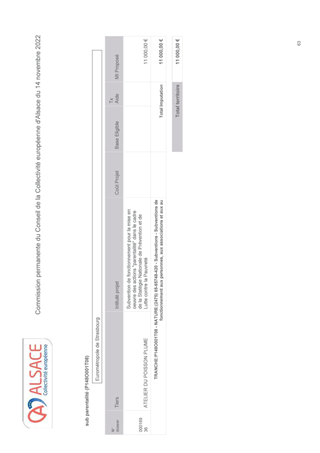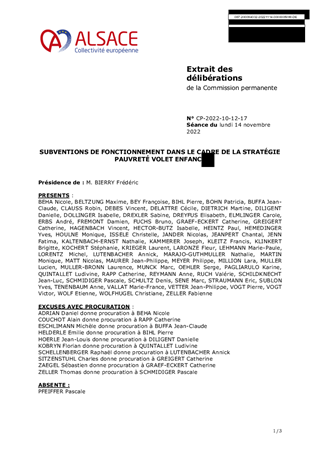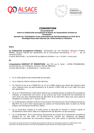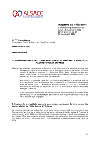 La stratégie nationale de prévention et de lutte contre la pauvreté attribue des financements aux actions portant sur la lutte contre les sorties sèches de l’aide sociale à l’enfance jusqu’au 31 décembre 2022. Deux actions portées par l’association Contact & Promotion ainsi que par le SIAO 67 s’intègrent dans cette démarche, pour un montant total de 64 060 €. Par ailleurs, la stratégie pauvreté contribue au financement d’actions de soutien à la parentalité. Trois subventions sont proposées à la Commission permanente dans ce cadre pour : l’association Poisson Plume (11 000 €), l’Association Générale des Familles du Haut-Rhin (2 000 €), ainsi que le Secours Populaire Français (5 000 €). Il est proposé de renouveler les subventions de fonctionnement accordées à ces structures pour un montant total de 82 060 € afin de permettre la poursuite de leurs actions déjà engagées.