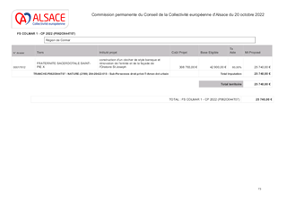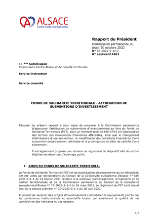 Le présent rapport a pour objet de proposer à la Commission permanente d'approuver l'attribution de subventions d'investissement au titre du Fonds de Solidarité Territoriale (FST), pour un montant total de 686 474 € et l'approbation des termes des conventions financières afférentes, ainsi que le changement d'attributaire d'une subvention, la modification des conditions financières d'une subvention précédemment attribuée et la prolongation du délai de validité d'une subvention. Il est également proposé une révision du règlement du dispositif afin de rendre éligibles les dépenses d'éclairage public.