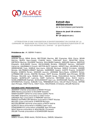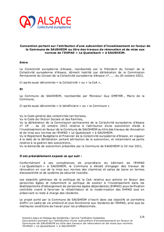 ATTRIBUTION D'UNE SUBVENTION D'INVESTISSEMENT EN FAVEUR DE LA COMMUNE DE SAUSHEIM AU TITRE DES TRAVAUX DE RESTRUCTURATION ET DE MISE AUX NORMES DE L'EHPAD " LE QUATELBACH "