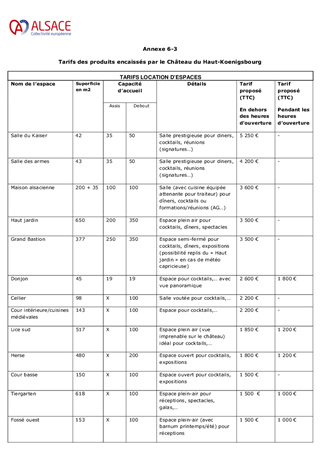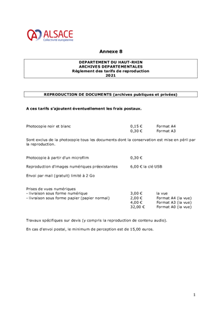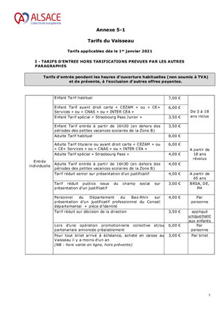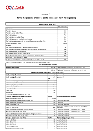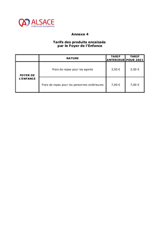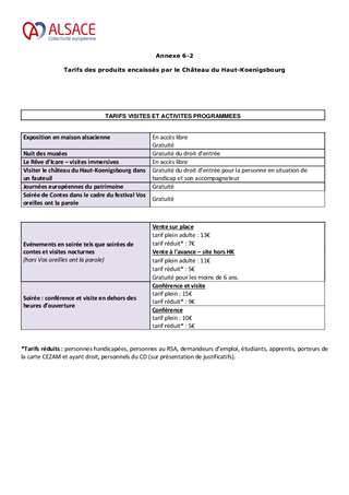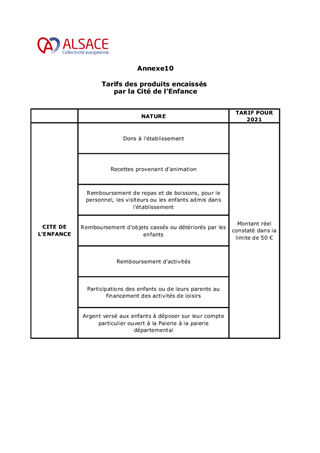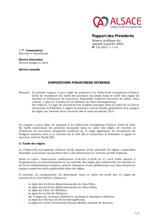 Le présent rapport a pour objet de proposer à la Collectivité européenne d'Alsace (CeA) de reconduire les tarifs des produits encaissés dans le cadre des régies de recettes et d’instituer de nouveaux dispositifs tarifaires (location de salles, Pass culture...) pour le Vaisseau et le Château du Haut-Koenigsbourg. Par ailleurs, il s'agit de reconduire les budgets annexes dans le cadre de la CeA et d'autoriser le Président à signer le nouveau contrat Payfip permettant aux usagers de régler par Internet leurs factures dès le mois de janvier 2021.