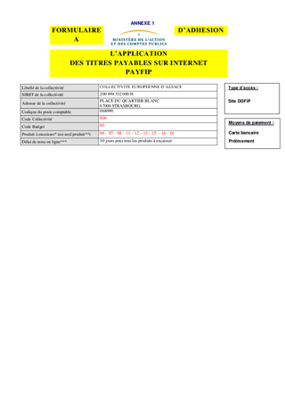 ANNEXE - FORMULAIRE D'ADHESION PAYFIP - BUDGET PRINCIPAL -