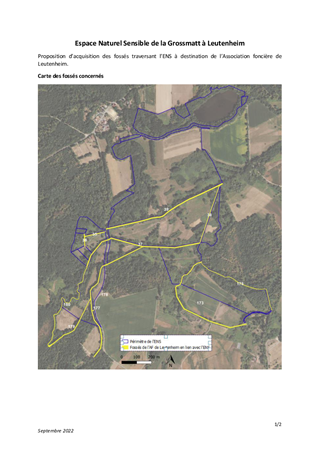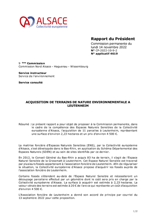 Le présent rapport a pour objet de proposer à la Commission permanente, dans le cadre de la compétence des Espaces Naturels Sensibles de la Collectivité européenne d’Alsace, l’acquisition de 11 parcelles à Leutenheim, représentant une surface d’environ 2,23 hectares et un prix d’environ 4 500 €.