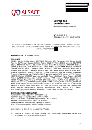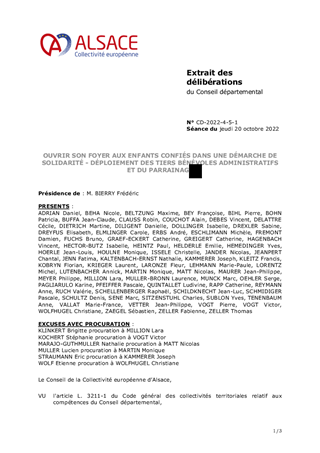 Le plan enfance porté par la Collectivité européenne d'Alsace (CeA) prévoit le déploiement des mesures alternatives au placement "classique" en encourageant, notamment, le recours aux Tiers Bénévoles Administratifs (TBA) et au parrainage. Cette volonté rejoint les dispositions de la loi Taquet du 7 février 2022. Des dispositifs d’accueil bénévoles dédiés principalement aux mineurs non accompagnés sont proposés depuis plusieurs années mais le recours aux tiers mérite d’être développé à destination également de l’ensemble des mineurs confiés à l’Aide Sociale à l’Enfance. Aussi, il est proposé de cadrer la démarche au sein de la CeA, sur la base d’outils homogénéisés (référentiel, convention) et de faire appel, via un marché public, à un prestataire pour valoriser l’action mais également évaluer et suivre les tiers. Un budget annuel de 80 000 € est prévu pour financer le recours à ce prestataire. Il est également proposé de verser une allocation mensuelle aux TBA alors que le parrainage resterait strictement bénévole. 1 894 140 € ont été inscrits au budget primitif 2022 pour financer les accueils par les tiers.