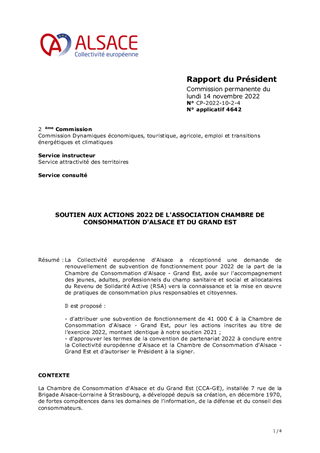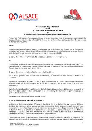 La Collectivité européenne d’Alsace a réceptionné une demande de renouvellement de subvention de fonctionnement pour 2022 de la part de la Chambre de Consommation d'Alsace - Grand Est, axée sur l'accompagnement des jeunes, adultes, professionnels du champ sanitaire et social et allocataires du Revenu de Solidarité Active (RSA) vers la connaissance et la mise en œuvre de pratiques de consommation plus responsables et citoyennes. Il est proposé : - d'attribuer une subvention de fonctionnement de 41 000 € à la Chambre de Consommation d'Alsace - Grand Est, pour les actions inscrites au titre de l’exercice 2022, montant identique à notre soutien 2021 ; - d’approuver les termes de la convention de partenariat 2022 à conclure entre la Collectivité européenne d'Alsace et la Chambre de Consommation d'Alsace - Grand Est et d’autoriser le Président à la signer.