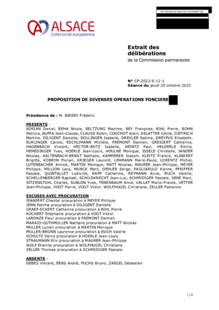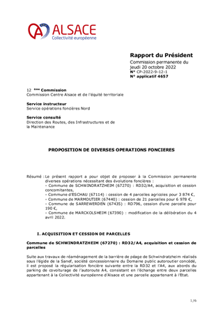 Le présent rapport a pour objet de proposer à la Commission permanente diverses opérations nécessitant des évolutions foncières : - Commune de SCHWINDRATZHEIM (67270) : RD32/A4, acquisition et cession concomitantes, - Commune d'ESCHAU (67114) : cession de 4 parcelles agricoles pour 3 874 €, - Commune de MARMOUTIER (67440) : cession de 21 parcelles pour 6 978 €, - Commune de SARREWERDEN (67435) : RD796, cession d'une parcelle pour 190 €, - Commune de MARCKOLSHEIM (67390) : modification de la délibération du 4 avril 2022.