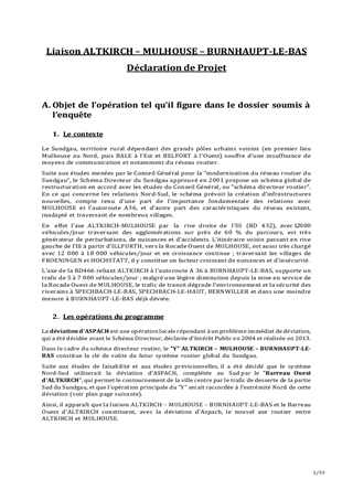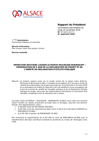 Le présent rapport porte sur le projet routier de la liaison entre Alltkirch, Mulhouse et Burnhaupt-le-Bas. Il propose la prorogation de 5 ans de la durée de validité de la Déclaration de projet prononcée par la Collectivité le 23 mars 2018 et la sollicitation du Préfet du Haut-Rhin afin de bénéficier d'une prorogation de 5 ans de la durée de validité de l'enquête publique et de la Déclaration d'Utilité Publique du projet, sans quoi les expropriations éventuelles ne pourraient être réalisées, empêchant ainsi la réalisation de la liaison.