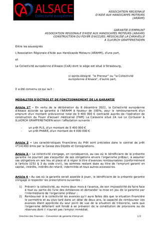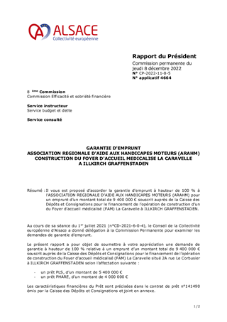Il vous est proposé d’accorder la garantie d'emprunt à hauteur de 100 % à l’ASSOCIATION REGIONALE D’AIDE AUX HANDICAPES MOTEURS (ARAHM) pour un emprunt d’un montant total de 9 400 000 € souscrit auprès de la Caisse des Dépôts et Consignations pour le financement de l’opération de construction d’un du Foyer d’accueil médicalisé (FAM) La Caravelle à ILLKIRCH GRAFFENSTADEN.