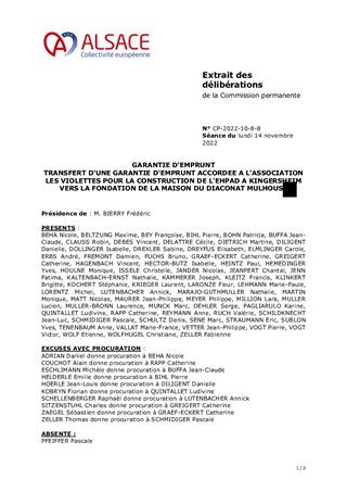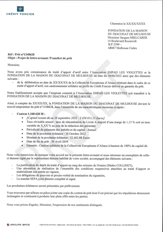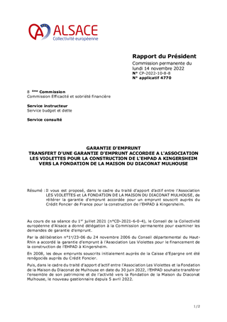 Il vous est proposé, dans le cadre du traité d’apport d’actif entre l’Association LES VIOLETTES et LA FONDATION DE LA MAISON DU DIACONAT MULHOUSE, de réitérer la garantie d'emprunt accordée pour un emprunt souscrit auprès du Crédit Foncier de France pour la construction de l’EHPAD à Kingersheim.