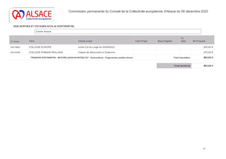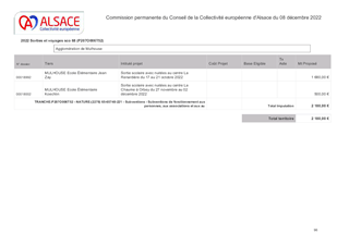 La Collectivité européenne d’Alsace, dans le cadre de sa politique éducative attribue des subventions pour les voyages et sorties scolaires organisés par les collèges et écoles publics et privés du Bas-Rhin et du Haut-Rhin. Au 20 octobre 2022, des subventions ont été attribuées pour 172 441 € aux collèges publics et privés du Bas-Rhin (10 395 élèves – 135 sorties et voyages scolaires) et pour 146 320 € aux collèges et aux écoles publics et privés du Haut-Rhin (3 967 élèves – 88 sorties scolaires avec nuitées). Ce rapport a pour objet de proposer à la Commission permanente d’attribuer des subventions de fonctionnement pour un montant total de 21 431,50 € pour les voyages et sorties scolaires vers les lieux de mémoire alsaciens des collèges publics et privés du Bas-Rhin (1135 élèves - 14 sorties et voyages scolaires) et les sorties scolaires avec nuitées pour les collèges et les écoles publics et privés du Haut-Rhin (133 élèves – 4 sorties scolaires avec nuitées).