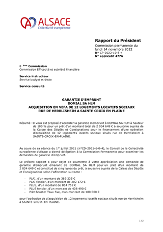 Il vous est proposé d’accorder la garantie d'emprunt à DOMIAL SA HLM à hauteur de 100 % pour un prêt d’un montant total de 2 034 649 € à souscrire auprès de la Caisse des Dépôts et Consignations pour le financement d'une opération d’acquisition de 12 logements locatifs sociaux situés rue de Herrlisheim à SAINTE-CROIX-EN-PLAINE.