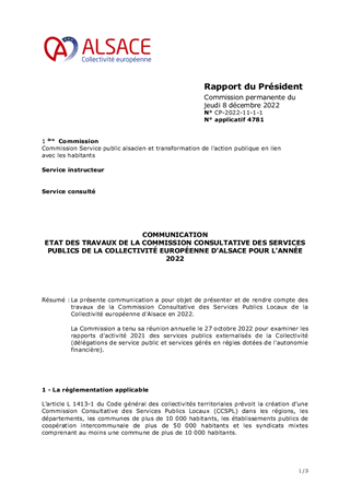 La présente communication a pour objet de présenter et de rendre compte des travaux de la Commission Consultative des Services Publics Locaux de la Collectivité européenne d'Alsace en 2022. La Commission a tenu sa réunion annuelle le 27 octobre 2022 pour examiner les rapports d'activité 2021 des services publics externalisés de la Collectivité (délégations de service public et services gérés en régies dotées de l'autonomie financière).