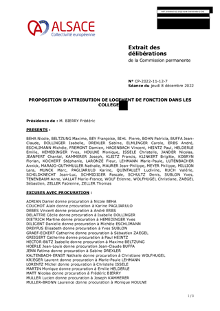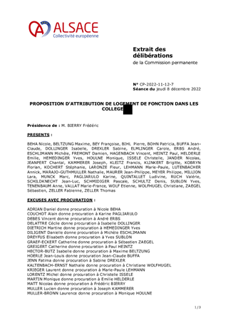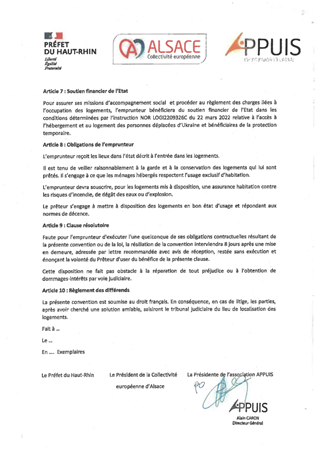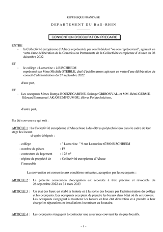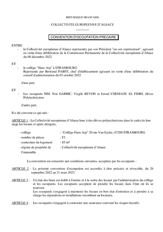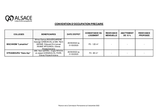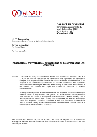 La Collectivité européenne d'Alsace décide, aux termes des articles L.213-4 et L.213-7 du code de l'éducation, de l'attribution des logements de service des collèges, sur proposition des conseils d'administration des établissements. Il est proposé à la Commission permanente de décider d'attribuer des logements inoccupés dans les collèges Hans Arp à Strasbourg et Lamartine à Bischheim, et d'approuver les termes du projet de convention d'occupation précaire correspondant. Il est également soumis à votre approbation, un projet de convention spécifique visant à mettre à disposition à titre gratuit, six appartements sur le périmètre Haut-Rhinois au bénéfice des populations déplacées d’Ukraine arrivant sur le territoire français, en lien avec l’État et l’association APPUIS (Accueil, Prévention, Protection, Urgence, Inclusion, Santé-social qui intervient dans le Haut-Rhin) pour la prise en charge et l’accompagnement des personnes, familles, adultes et enfants pour une durée de douze mois.