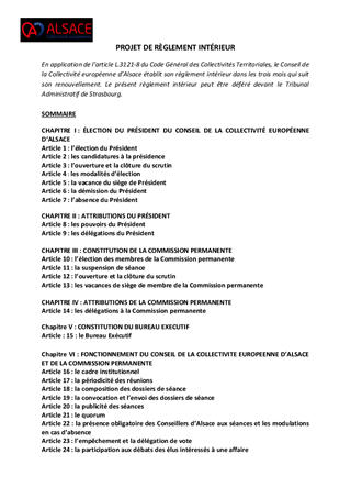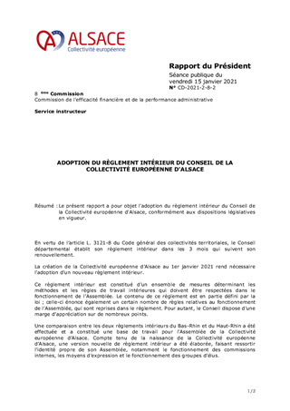 Le présent rapport a pour objet l'adoption du règlement intérieur du Conseil de la Collectivité européenne d'Alsace, conformément aux dispositions législatives en vigueur.