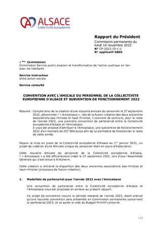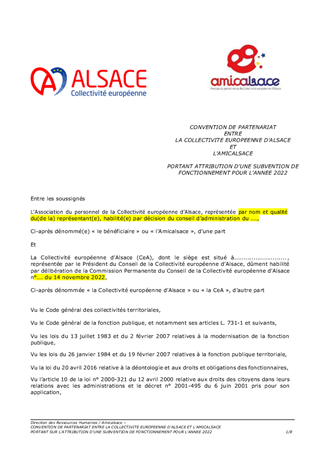 Compte tenu de la création d'une nouvelle amicale du personnel le 27 septembre 2022, dénommée l’ « Amicalsace », née de la fusion-création des deux anciennes associations bas-rhinoise et haut-rhinoise, il convient de conclure, pour le reste de l’année 2022, une première convention de partenariat entre la Collectivité européenne d'Alsace et l’Amicalsace. Il vous est proposé d’attribuer à l’Amicalsace, une subvention de fonctionnement 2022 d’un montant de 207 500 euros afin de lui permettre de fonctionner le reste de cette année.