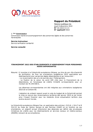Il incombe à la Collectivité européenne d’Alsace, au titre de son rôle d’autorité de tarification, de fixer les orientations budgétaires 2023 applicables aux établissements pour personnes âgées dépendantes et qui recouvrent : - La revalorisation des prix de journée pour l’hébergement, - La fixation de la valeur du point GIR cible pour le financement de la dépendance, et l’enveloppe de crédits limitatifs correspondante pour un montant de 76 240 000 €, Les dépenses correspondantes ont été intégrées aux orientations budgétaires 2023 de la Collectivité. L’adoption du présent rapport avant le vote du budget de la Collectivité permet la mise en œuvre des revalorisations tarifaires dès janvier 2023 et de limiter ainsi l’impact financier pour les résidents d’une actualisation tarifaire plus tardive durant l’année.