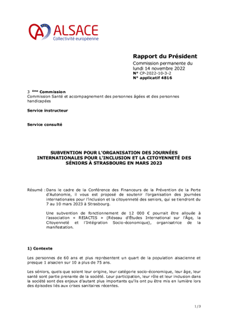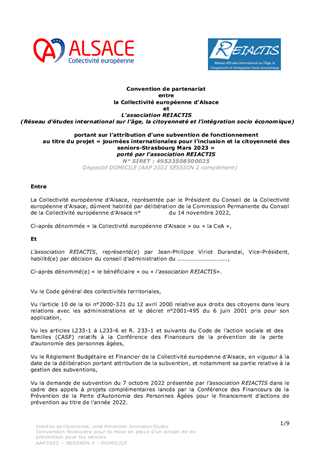 Dans le cadre de la Conférence des Financeurs de la Prévention de la Perte d’Autonomie, il vous est proposé de soutenir l’organisation des journées internationales pour l’inclusion et la citoyenneté des seniors, qui se tiendront du 7 au 10 mars 2023 à Strasbourg. Une subvention de fonctionnement de 12 000 € pourrait être allouée à l’association « REIACTIS » (Réseau d'Études International sur l'Âge, la Citoyenneté et l'Intégration Socio-économique), organisatrice de la manifestation.