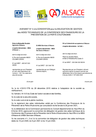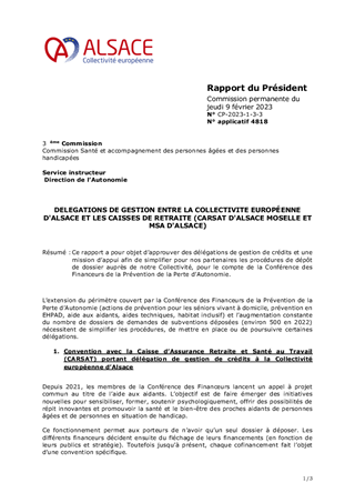Ce rapport a pour objet d’approuver des délégations de gestion de crédits et une mission d’appui afin de simplifier pour nos partenaires les procédures de dépôt de dossier auprès de notre Collectivité, pour le compte de la Conférence des Financeurs de la Prévention de la Perte d’Autonomie.