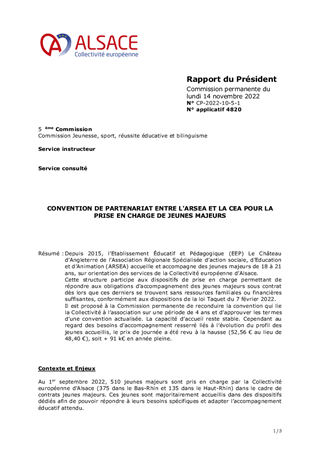 Depuis 2015, l’Etablissement Éducatif et Pédagogique (EEP) Le Château d’Angleterre de l’Association Régionale Spécialisée d’action sociale, d’Education et d’Animation (ARSEA) accueille et accompagne des jeunes majeurs de 18 à 21 ans, sur orientation des services de la Collectivité européenne d’Alsace. Cette structure participe aux dispositifs de prise en charge permettant de répondre aux obligations d’accompagnement des jeunes majeurs sous contrat dès lors que ces derniers se trouvent sans ressources familiales ou financières suffisantes, conformément aux dispositions de la loi Taquet du 7 février 2022. Il est proposé à la Commission permanente de reconduire la convention qui lie la Collectivité à l’association sur une période de 4 ans et d’approuver les termes d’une convention actualisée. La capacité d’accueil reste stable. Cependant au regard des besoins d’accompagnement resserré liés à l’évolution du profil des jeunes accueillis, le prix de journée a été revu à la hausse (52,56 € au lieu de 48,40 €), soit + 91 k€ en année pleine.